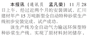匯川建材新型自全自動特種砂漿生產(chǎn)線投產(chǎn)